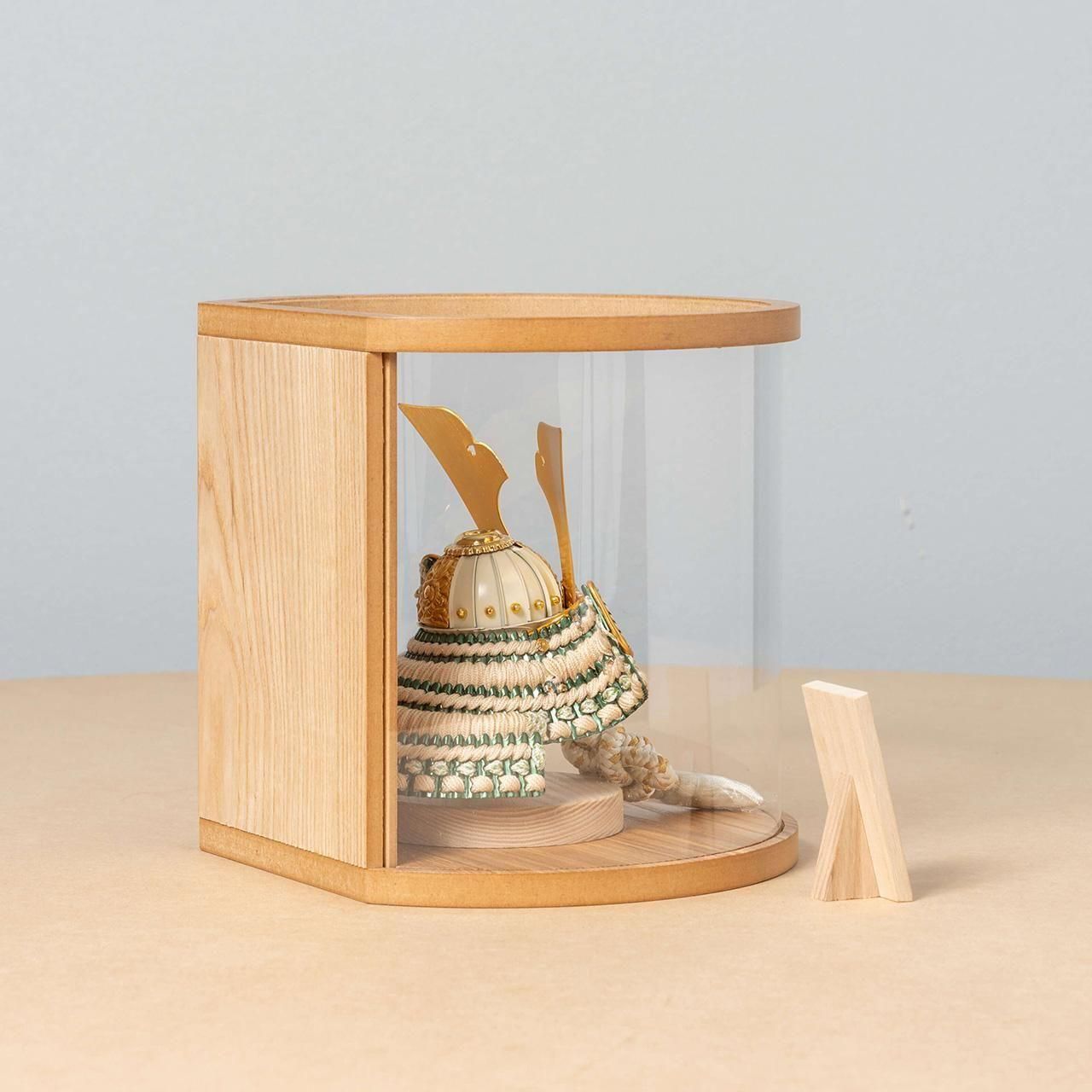 角をなくし丸みをつけた円柱型のケースは従来のケースにある柱がない為、中に飾る兜がより見やすくなっております。