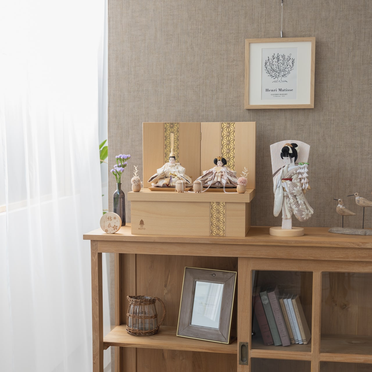精巧な凛として美しい佇まいを天然木の優しいぬくもりが包み込む・・・まるで女の子の成長を温かく見守る家族の様に・・・そんなコンセプトから生まれた、親しみやすく、お子様と一緒に飾れる「ことの雛人形」です。コンパクトでちょうどいいサイズコンパクトでちょうどいいサイズ今どきのおうちに合わせたコンパクトなサイズに仕上げました。飾るスペースが狭くなりがちなマンションや子ども部屋にもぴったり。お部屋のイメージに調和するデザインお部屋のイメージに調和するデザイン天然木の素材を活かしたシンプルなデザインだから、お部屋の雰囲気にもピッタリ。お衣装へのこだわり 〜正絹 二重蔓牡丹文〜お衣装へのこだわり 〜正絹 二重蔓牡丹文〜日本の伝統的な文様の一つである、牡丹の花と唐草模様が組み合わさった「牡丹唐草」。牡丹には「不老不死」と「不老長寿」という意味が込められており、また、華やかで美しい牡丹の花は美と富の象徴とされています。そんな牡丹唐草の柄と小さいながらも光沢のある生地を合わせ、可愛らしさと高級感のある雛人形に仕上げました。手作りへのこだわり〜裂地(きれじ)の裁断手作りへのこだわり〜裂地(きれじ)の裁断和紙で衣裳の各種型紙を作り、へり部分にのみ糊をつけ、裂地裏面に貼り付けます。型紙に沿って裁断して衣裳部品を作っていきます。手作りへのこだわり〜縫製手作りへのこだわり〜縫製姫の十二単の唐衣(からぎぬ)・五衣(いつつぎぬ)・単衣(ひとえ)・裾、殿の着物・裾・中袖等、数多くの衣裳部品をミシン、または手縫いで細やかな部分まで縫い合わせ、折り込み仕上げていきます。手作りへのこだわり〜着付け・振付け手作りへのこだわり〜着付け・振付け仕上がった衣裳は両腕を後方に曲げて羽織らせるようにして着付けます。次にそれぞれの人形の形に振付けます。腕を曲げる角度や手の位置などで全体のバランスを取ります。手作りへのこだわり〜頭差し手作りへのこだわり〜頭差し頭さしは最終の人形検品を兼ねて行われます。包まれた顔紙を外し、汚れ等無いことを確認します。頭と衣紋の中心線が一直線になるように差し込みます。ことのお雛様ことのお雛様お雛様の顔は時代とともに人気のお顔があります。ことのお雛様のお顔は時代に左右されない普遍的なシンプルで可愛らしいお顔となっています。健やかな成長への願いを込めた麻の葉文様健やかな成長への願いを込めた麻の葉文様古来からの日本伝統の吉祥文様である麻の葉文様。麻の丈夫さ・成長の早さにあやかり、お子さまの健やかな成長への願いが込められています。お子さまの感性を育む天然木へのこだわりお子さまの感性を育む天然木へのこだわり素材には、タモ、ブナといった天然木を使用。お子さまへの一生に一度の贈り物だから、木都は自然素材の天然木にこだわり続けています。※ 生産時期により使用する素材が一部変更になる場合がございます。熟練の職人による確かな手仕事熟練の職人による確かな手仕事伝統工芸の技術を受け継ぐ日本国内の熟練の職人が、一つひとつ丁寧に手づくりしています。おしゃれなギフト包装でお届けしますおしゃれなギフト包装でお届けします和の雰囲気を感じさせる越前和紙のギフト用ラッピングでお届け。料金がわかるものもお入れしていないので、そのまま贈り物として利用できます。商品レビュー記入でもれなくもらえる天然木のミニ名前札プレゼント商品レビュー記入でもれなくもらえる天然木のミニ名前札プレゼントミニサイズのお名前札 (通常販売価格1,980円) をプレゼント♪商品到着後、商品レビューをご記入の上、商品と同梱のチラシ記載のQRコードから応募フォームへ必要事項をご入力ください。店舗よりレビュー特典を発送いたします。※ お名前札の生年月日の表記は和暦となります。(例:令和八年)商品のご注文へ収納方法とセット内容お内裏様・お雛様・屏風・収納箱・親王台・人形小道具・貝桶×2・花飾り×2・羽子板・台座屏風は収納箱の上に乗せてダンボール箱におしまい下さい。素材:ブナひな人形サイズ:W450mm × D300mm × H415mm(梱包時) W490mm × D315mm × H215mm(人形のみ) 殿:約 W185mm × D165mm × H215mm 姫:約 W220mm × D190mm × H125mm羽子板サイズ:W150mm × D125mm × H350mm(梱包時) W180mm × D390mm × H100mm注意事項色合いなど実際のものと写真とでは多少の誤差が生じる場合がございます。また、手作りであり天然木を使用している為、多少の仕様の変化や風合いがひとつひとつ異なります。あらかじめご了承ください。部品には小さなものがございます。お子様がお口に入れないようにご注意ください。材質により木の刻印の濃淡に差が生じますが不良品ではございません。木製品である限り自然なこととご承知下さいませ。保管場所は変色やカビ、サビの原因になりますので湿気の少ない場所・直射日光の当たらない場所に保管してください。雄雛の正面にあります飾り帯のビニールは外さないでください。本