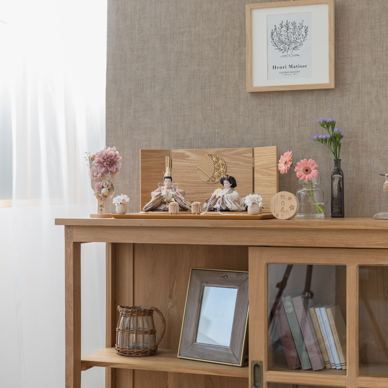精巧な凛として美しい佇まいを天然木の優しいぬくもりが包み込む・・・まるで女の子の成長を温かく見守る家族の様に・・・そんなコンセプトから生まれた、親しみやすく、お子様と一緒に飾れる「ことの雛人形」です。コンパクトでちょうどいいサイズコンパクトでちょうどいいサイズ今どきのおうちに合わせたコンパクトなサイズに仕上げました。飾るスペースが狭くなりがちなマンションや子ども部屋にもぴったり。お部屋のイメージに調和するデザインお部屋のイメージに調和するデザイン天然木の素材を活かしたシンプルなデザインだから、お部屋の雰囲気にもピッタリ。雪輪流水紋様雪輪流水紋様白地の地紋には日本古来から愛され縁起の良い紋様して伝わる七宝紋様も施されております。流水柄は落ち着いた現代色で雛人形様に織り上げた別誂の西陣織となります。手作りへのこだわり〜裂地(きれじ)の裁断手作りへのこだわり〜裂地(きれじ)の裁断和紙で衣裳の各種型紙を作り、へり部分にのみ糊をつけ、裂地裏面に貼り付けます。型紙に沿って裁断して衣裳部品を作っていきます。手作りへのこだわり〜縫製手作りへのこだわり〜縫製姫の十二単の唐衣(からぎぬ)・五衣(いつつぎぬ)・単衣(ひとえ)・裾、殿の着物・裾・中袖等、数多くの衣裳部品をミシン、または手縫いで細やかな部分まで縫い合わせ、折り込み仕上げていきます。手作りへのこだわり〜着付け・振付け手作りへのこだわり〜着付け・振付け仕上がった衣裳は両腕を後方に曲げて羽織らせるようにして着付けます。次にそれぞれの人形の形に振付けます。腕を曲げる角度や手の位置などで全体のバランスを取ります。手作りへのこだわり〜頭差し手作りへのこだわり〜頭差し頭さしは最終の人形検品を兼ねて行われます。包まれた顔紙を外し、汚れ等無いことを確認します。頭と衣紋の中心線が一直線になるように差し込みます。ことのお雛様ことのお雛様お雛様の顔は時代とともに人気のお顔があります。ことのお雛様のお顔は時代に左右されない普遍的なシンプルで可愛らしいお顔となっています。健やかな成長への願いを込めた麻の葉文様健やかな成長への願いを込めた麻の葉文様古来からの日本伝統の吉祥文様である麻の葉文様。麻の丈夫さ・成長の早さにあやかり、お子さまの健やかな成長への願いが込められています。お子さまの感性を育む天然木へのこだわりお子さまの感性を育む天然木へのこだわり素材には、タモ、ブナといった天然木を使用。お子さまへの一生に一度の贈り物だから、木都は自然素材の天然木にこだわり続けています。※ 生産時期により使用する素材が一部変更になる場合がございます。熟練の職人による確かな手仕事熟練の職人による確かな手仕事伝統工芸の技術を受け継ぐ日本国内の熟練の職人が、一つひとつ丁寧に手づくりしています。おしゃれなギフト包装でお届けしますおしゃれなギフト包装でお届けします和の雰囲気を感じさせる越前和紙のギフト用ラッピングでお届け。料金がわかるものもお入れしていないので、そのまま贈り物として利用できます。商品レビュー記入でもれなくもらえる天然木のミニ名前札プレゼント商品レビュー記入でもれなくもらえる天然木のミニ名前札プレゼントミニサイズのお名前札 (通常販売価格1,980円) をプレゼント♪商品到着後、商品レビューをご記入の上、商品と同梱のチラシ記載のQRコードから応募フォームへ必要事項をご入力ください。店舗よりレビュー特典を発送いたします。※ お名前札の生年月日の表記は和暦となります。(例:令和八年)商品のご注文へ収納方法とセット内容お内裏様・お雛様・屏風・平台・親王台・人形小道具・貝桶×2・花飾り×2・羽子板・台座屏風は平台と同様に個別でダンボール箱におしまい下さい。親王台は屏風のダンボールに入れます。素材:タモひな人形サイズ:W485mm × D290mm × H215mm(梱包時) W550mm × D355mm × H480mm(人形のみ) 殿:約 W155mm × D120mm × H200mm 姫:約 W155mm × D175mm × H120mm羽子板サイズ:W110mm × D60mm × H200mm(梱包時) W135mm × D270mm × H60mm注意事項色合いなど実際のものと写真とでは多少の誤差が生じる場合がございます。また、手作りであり天然木を使用している為、多少の仕様の変化や風合いがひとつひとつ異なります。あらかじめご了承ください。部品には小さなものがございます。お子様がお口に入れないようにご注意ください。材質により木の刻印の濃淡に差が生じますが不良品ではございません。木製品である限り自然なこととご承知下さいませ。保管場所は変色やカビ、サビの原因になりますので湿気の少ない場所・直射日光の当たらない場所に保管してください。雄雛の正面にあります飾り帯のビニールは外さないでください。本商品に行燈は付属しておりません。別途お買い求めください。受注生産品のため、時期によりお届け時期が前後する場合がございます。ご不明点がございましたら > お問い合わせページ からご